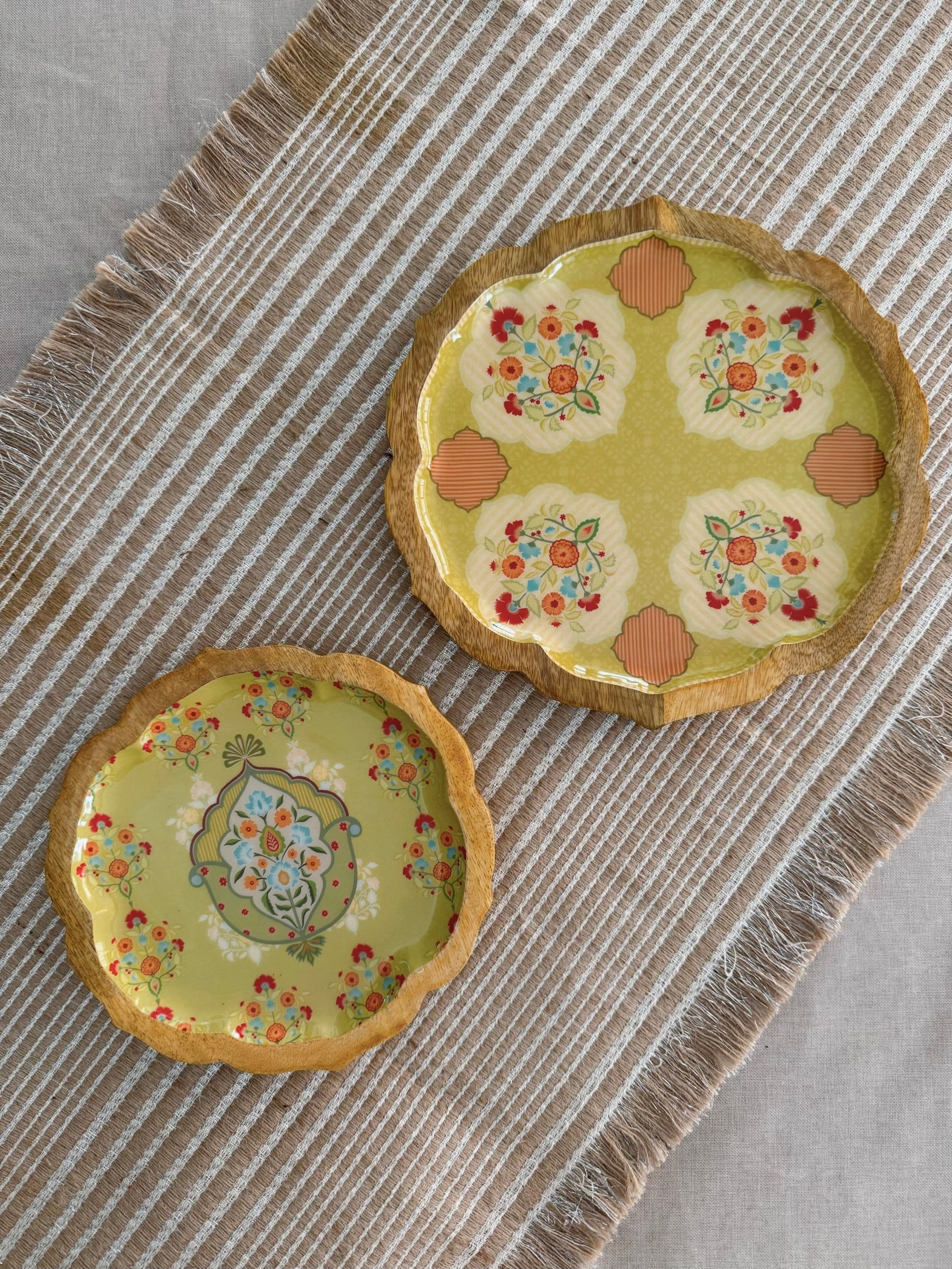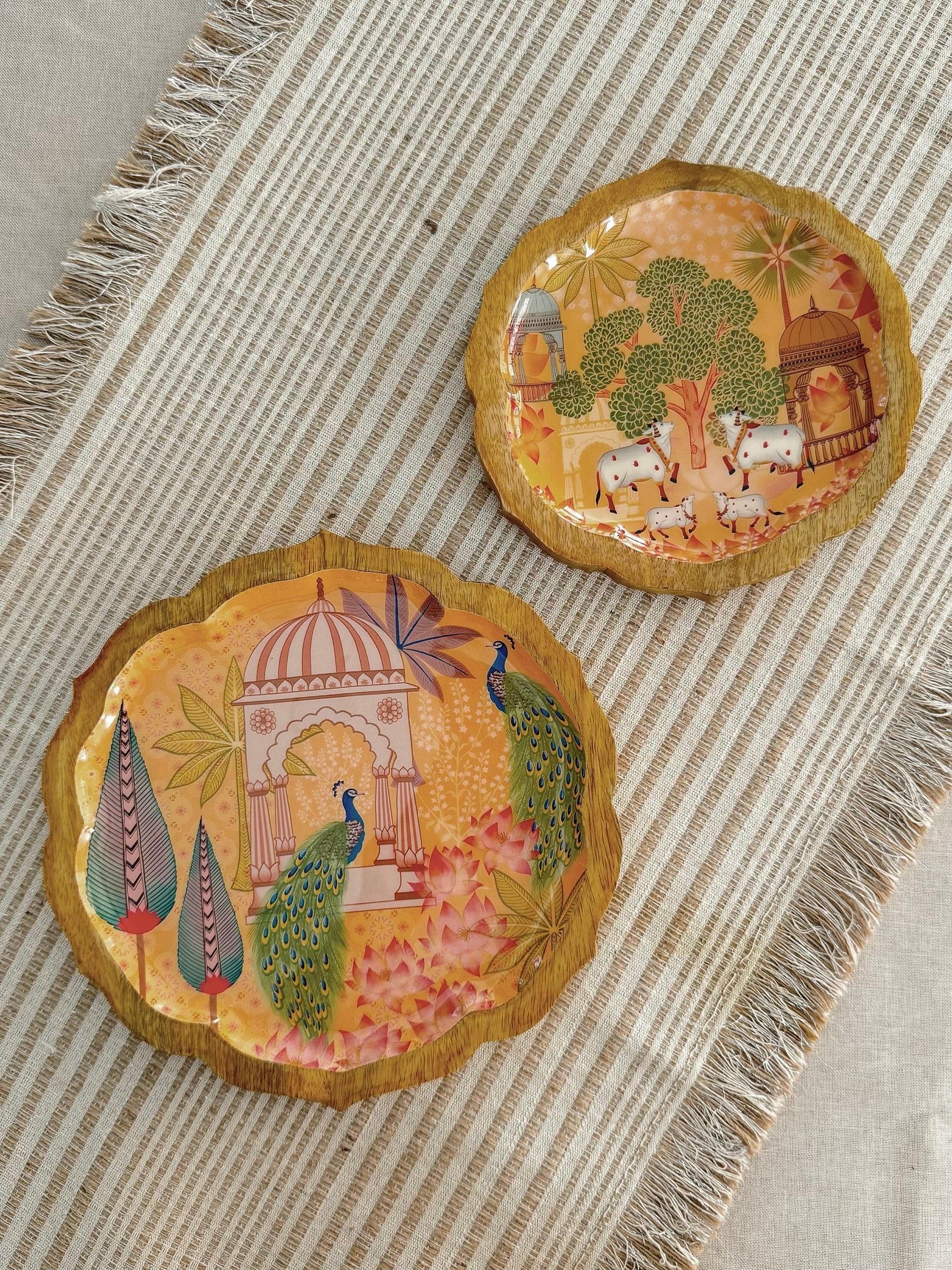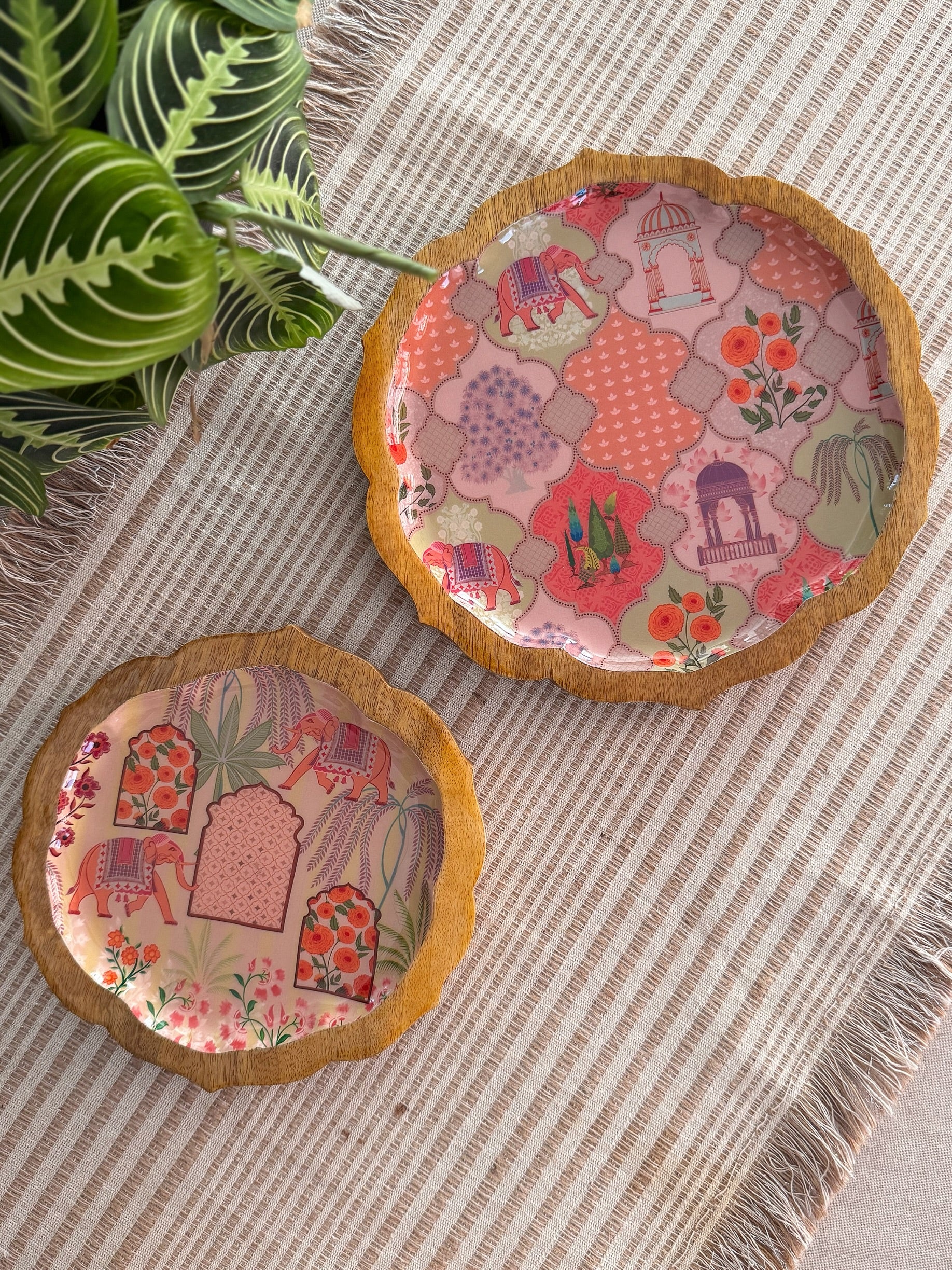 Apportez couleur, caractère et créativité à chaque repas. Nos plateaux Pankh arborent des illustrations numériques exclusives, conçues en interne par le studio The Marigold Touch. Ces motifs exclusifs sont imprimés sur des supports en bois de manguier grâce à une technologie d'émaillage alimentaire , alliant ainsi art et fonctionnalité dans une création d'une grande beauté.