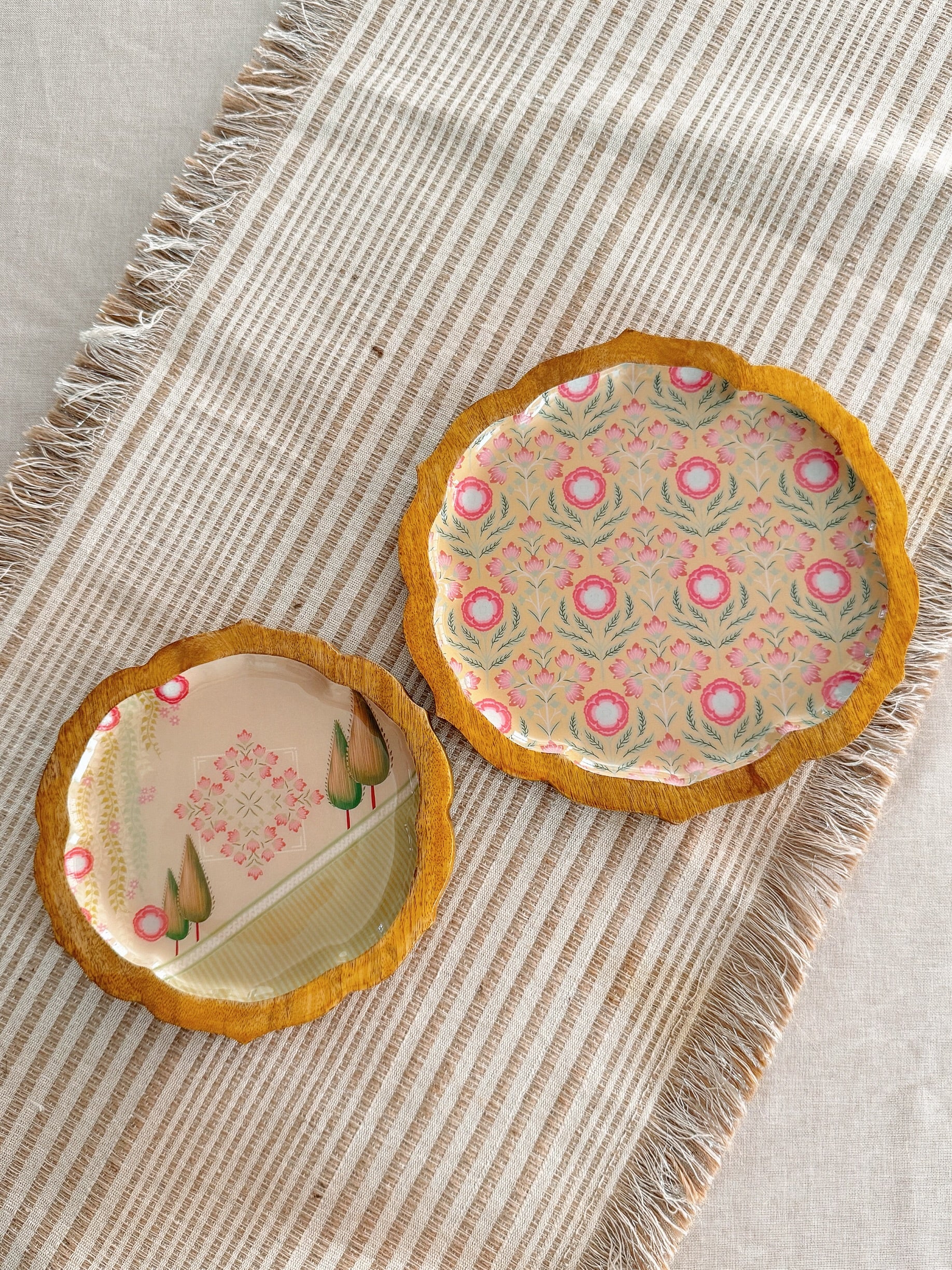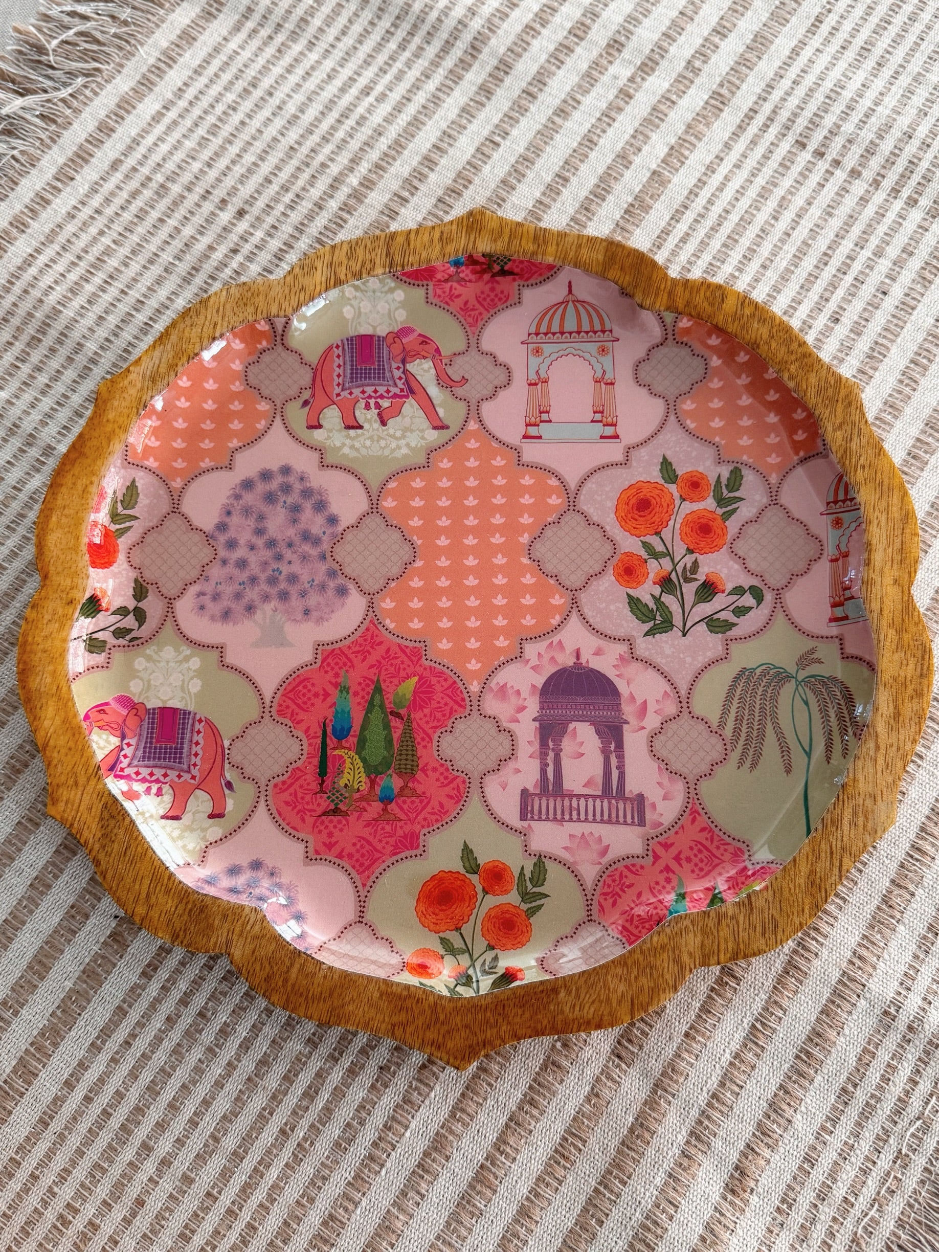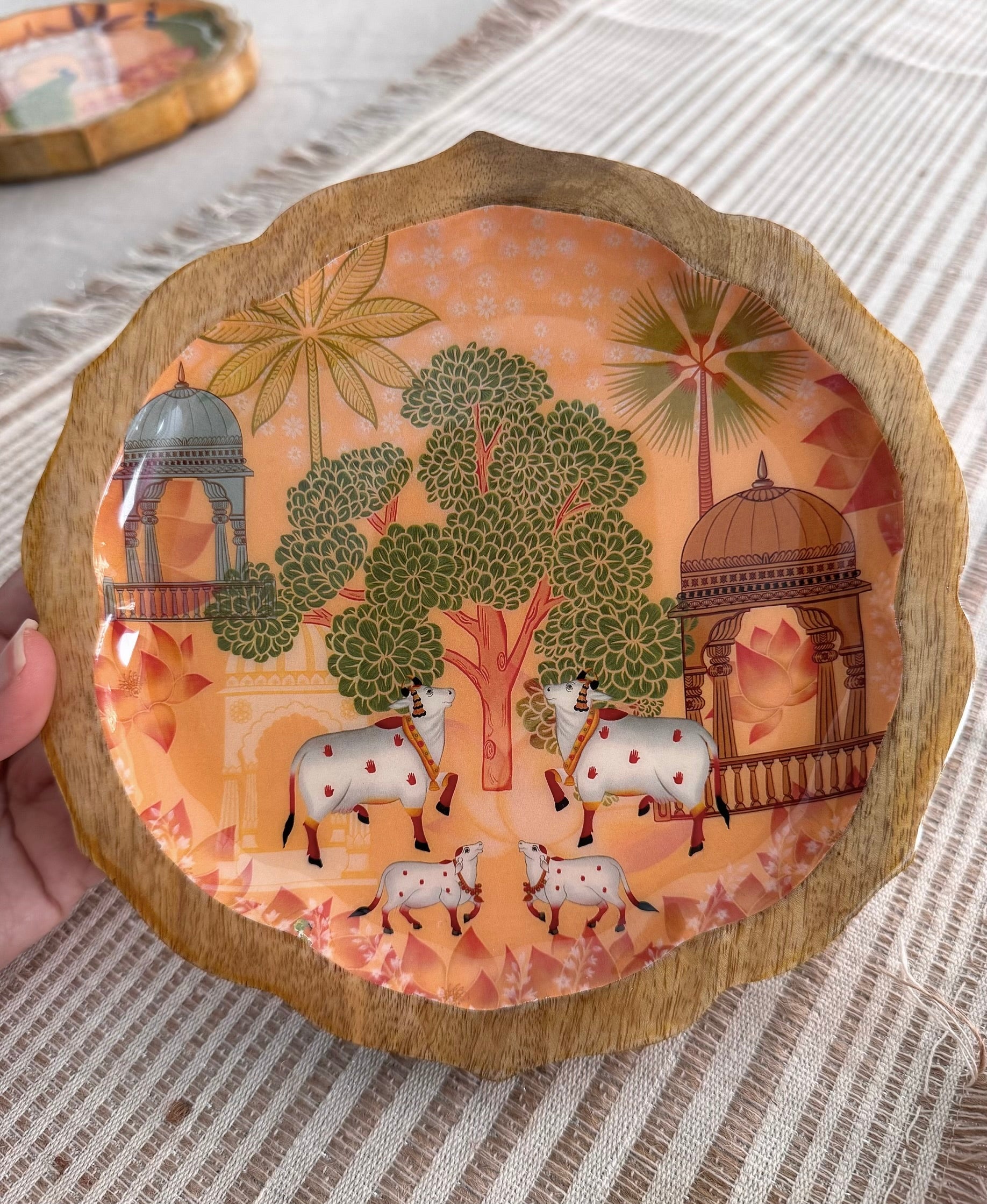 Apportez couleur, caractère et créativité à chaque repas. Nos plateaux Pankh arborent des illustrations numériques exclusives, conçues en interne par le studio The Marigold Touch. Ces motifs exclusifs sont imprimés sur des supports en bois de manguier grâce à une technologie d'émaillage alimentaire , alliant ainsi art et fonctionnalité dans une création d'une grande beauté.