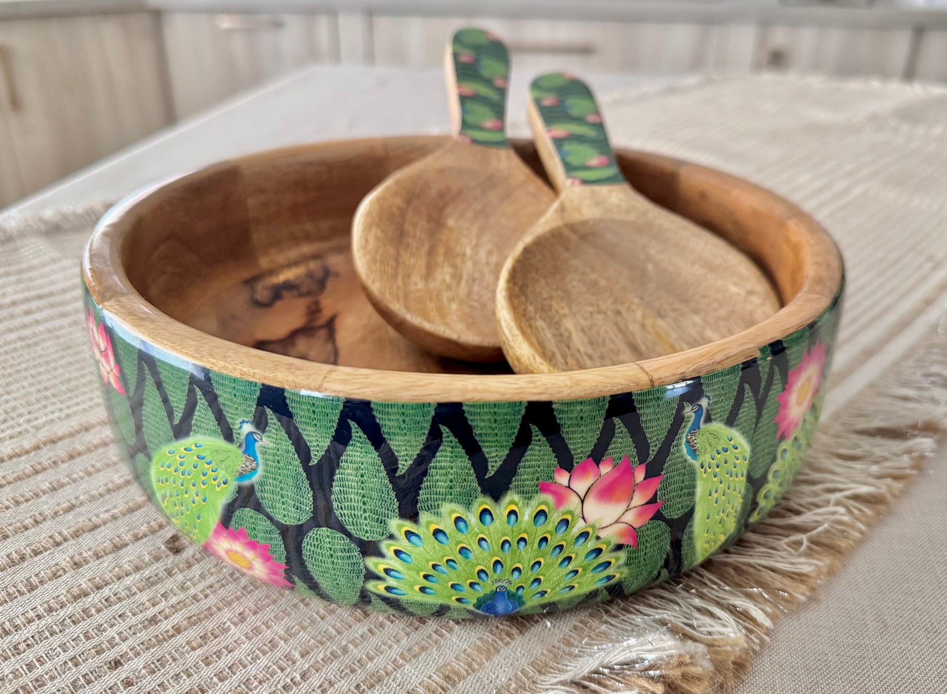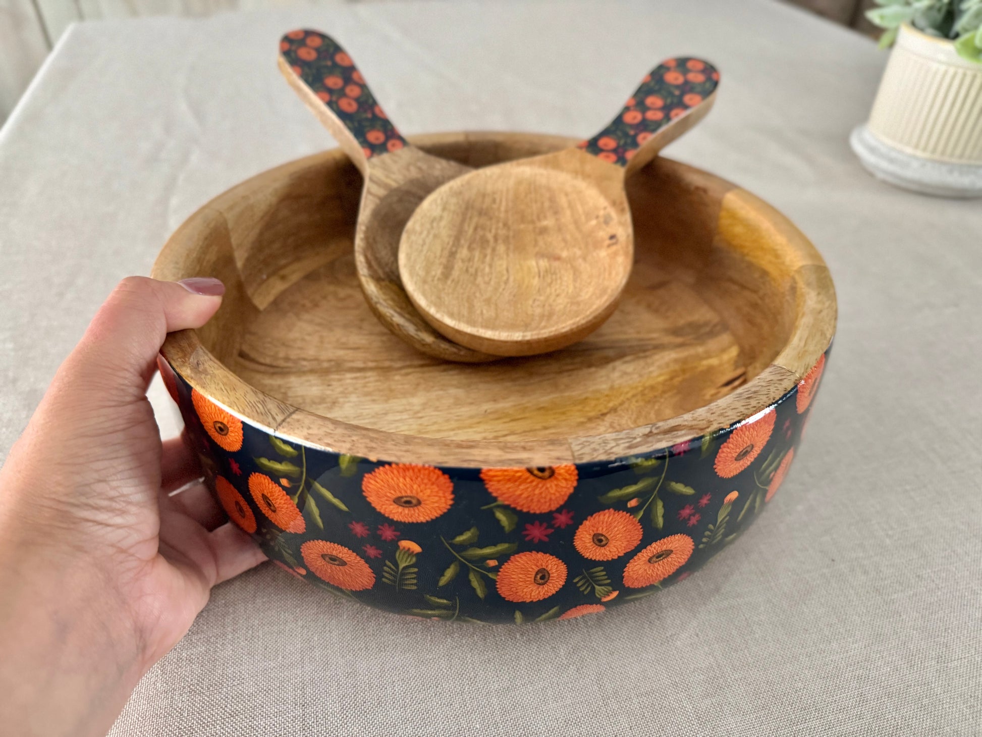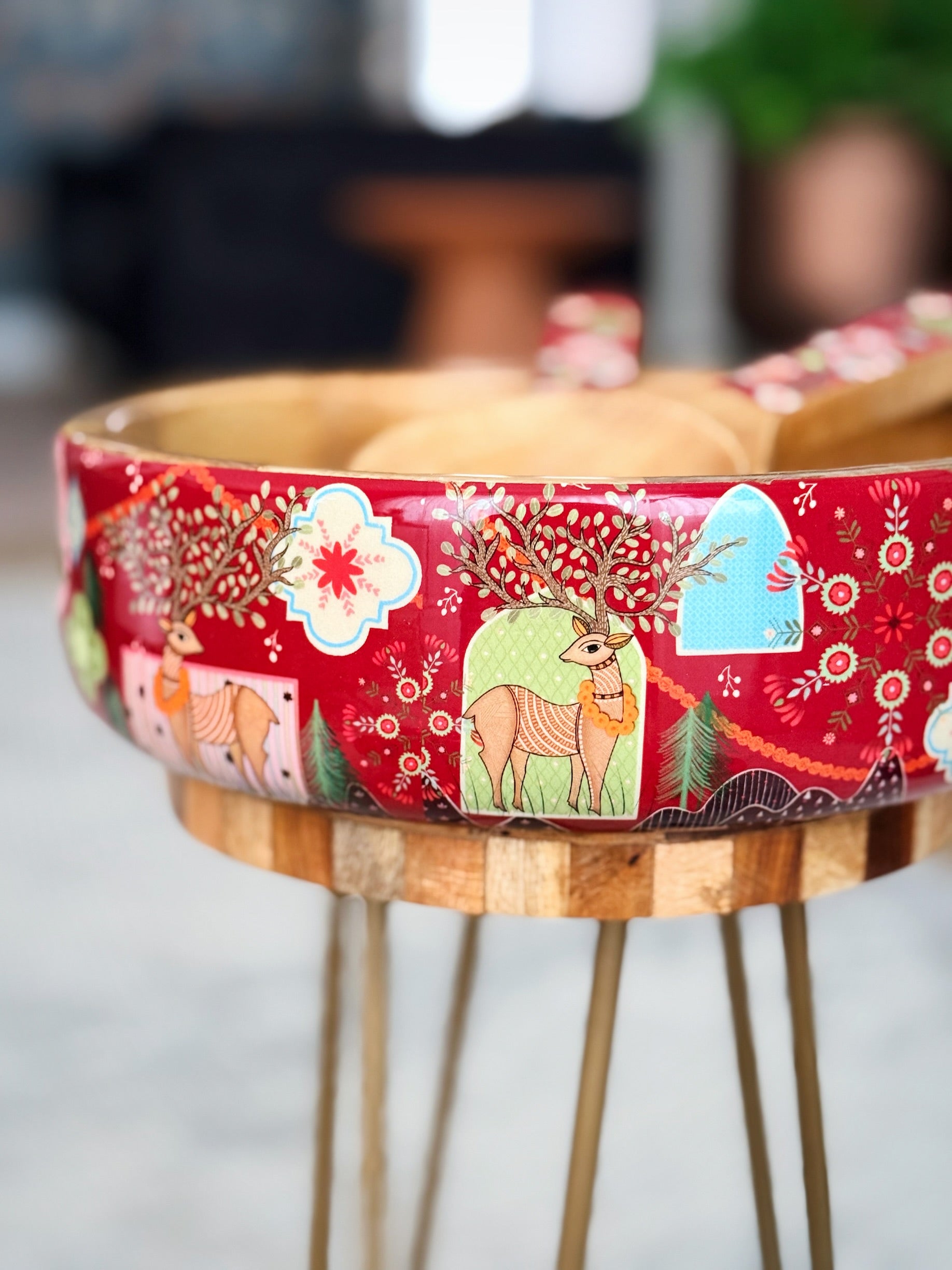 The Prithvi Salad Bowl celebrates the warmth of mango wood and the elegance of art. Each bowl carries our proprietary in-house digital design printed using food-safe enamel, making it a unique blend of sustainability and style.